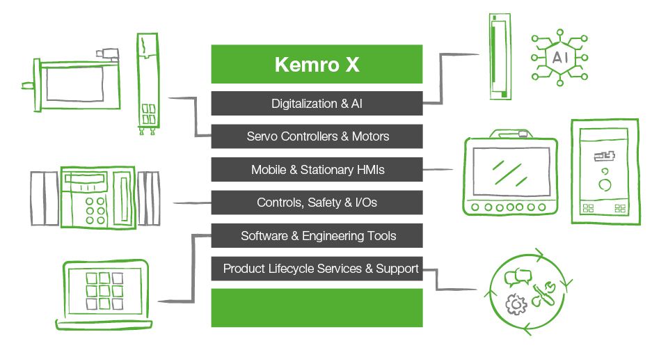Die Komponenten des Kemro X Produkt- & Dienstleistungsportfolio lassen sich flexibel miteinander kombinieren und ergeben so eine ganzheitliche Lösung für industrielle Automatisierung. 3rd-Party-Komponenten können aufgrund der offenen System-Architektur und den standardisierten Schnittstellen problemlos in Kemro X integriert werden.