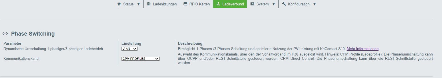 - Im Web-Interface (siehe Abb.2) unter Ladeverbund, Phase Switching aktivieren der Dynamische Umschaltung 1-phasiger/3-phasiger Ladebetrieb.