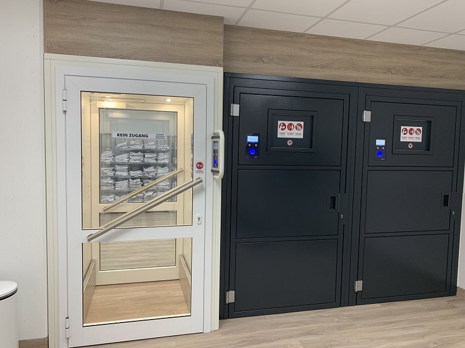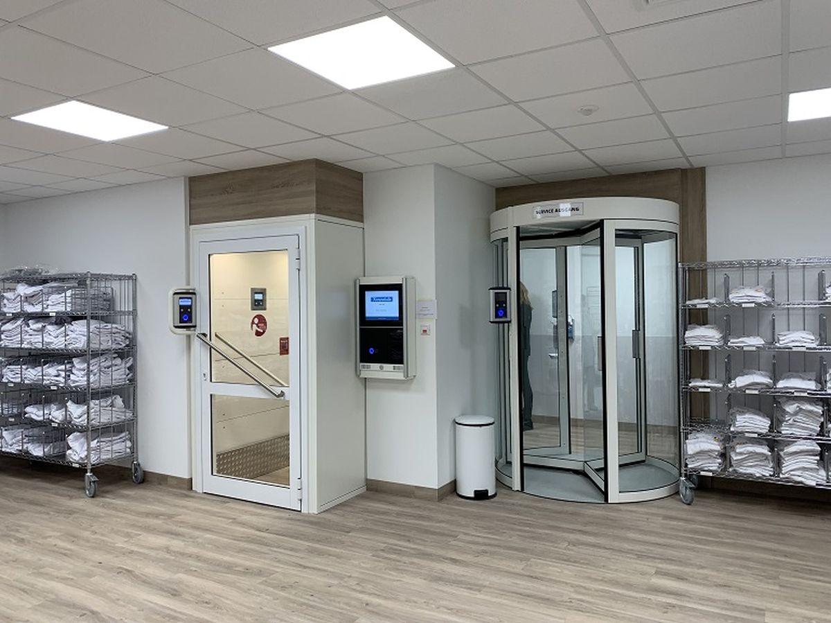 Das Hygiene-Kit enthält einen Desinfektionsmittelspender mit einem Fassungsvermögen von 500 ml und ist an das System angeschlossen. Nur nach Benutzung des Hygienespenders kann man durch das Glasdrehkreuz eintreten. So bleibt die Wäsche im Raum hygienisch einwandfrei.