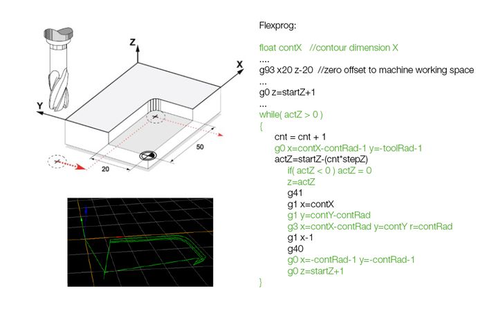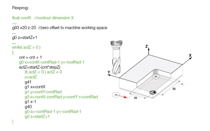 With FlexProg, you can expand your CNC programming with powerful elements of modern high-level languages—directly in G-code. Instead of pure parameter programming, you have access to structured programming constructs such as loops, conditions, procedures, and variables. Even complex mathematical expressions can be implemented efficiently. This not only significantly reduces implementation time, but also increases the readability, maintainability, and reusability of your programs. FlexProg enables modular and flexible programming—ideal for complex machining strategies and customized automation solutions.
