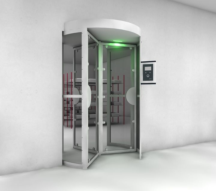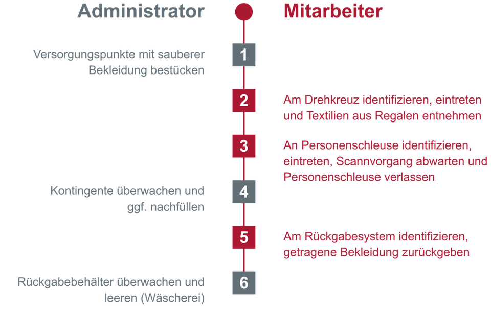 With our room solution, the central laundry store is transformed into an intelligent, automated clothing depot. For the purpose, the existing laundry distribution room is equipped with an access control point and a personnel airlock. Following successful identification, for example at a turnstile access point, the employee is allowed in and can collect the required textiles.