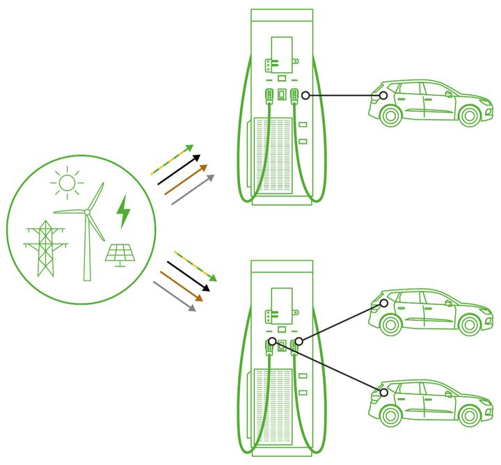 - Charge parallèle de deux véhicules électriques à 160 kW chacun avec transfert de puissance libérée